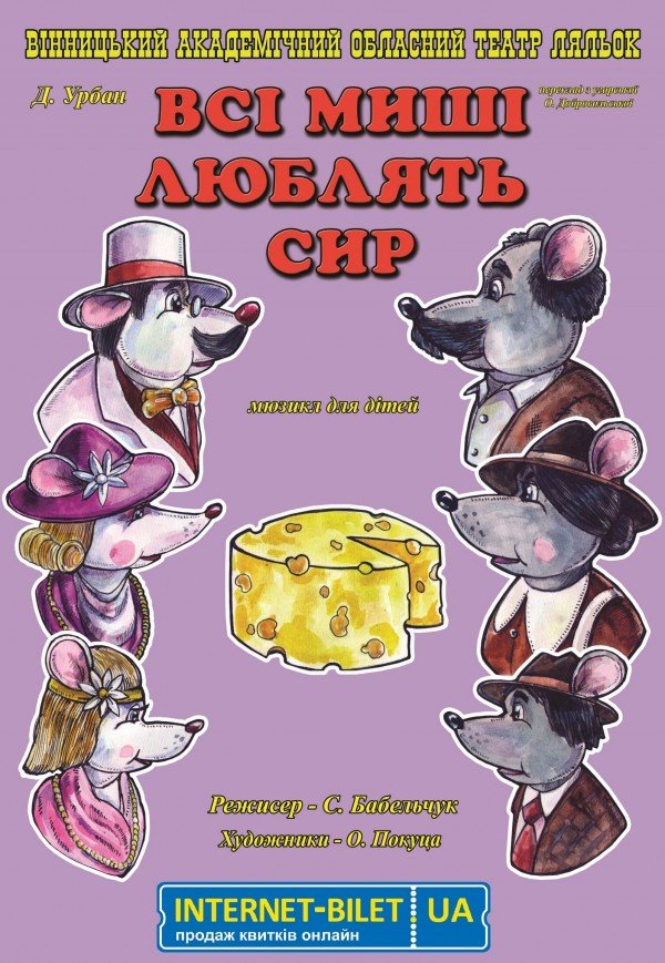Лялькова вистава «Всі миші люблять сир» відбудеться 29 березня 2026, 11:00, неділя в Вінницький академічний обласний театр ляльок. За допомогою сервісу internet-bilet.ua, Ви зможете з легкістю забронювати, замовити та купити квитки на концерт, спектакль, оперу, балет, майстер-класи, спортивні та дитячі заходи, що Вас цікавлять, оплативши їх найбільш зручним для Вас способом: через інтернет банківською карткою VISA/MasterCard, готівкою або кур'єром, якщо зробите замовлення квитка з доставкою.