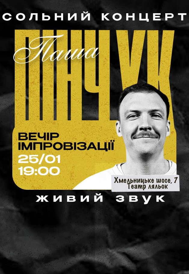 Вечір імпровізації Паші Пінчука відбудеться 25 січня 2026, 19:00, неділя в Вінницький академічний обласний театр ляльок. За допомогою сервісу internet-bilet.ua, Ви зможете з легкістю забронювати, замовити та купити квитки на концерт, спектакль, оперу, балет, майстер-класи, спортивні та дитячі заходи, що Вас цікавлять, оплативши їх найбільш зручним для Вас способом: через інтернет банківською карткою VISA/MasterCard, готівкою або кур'єром, якщо зробите замовлення квитка з доставкою.